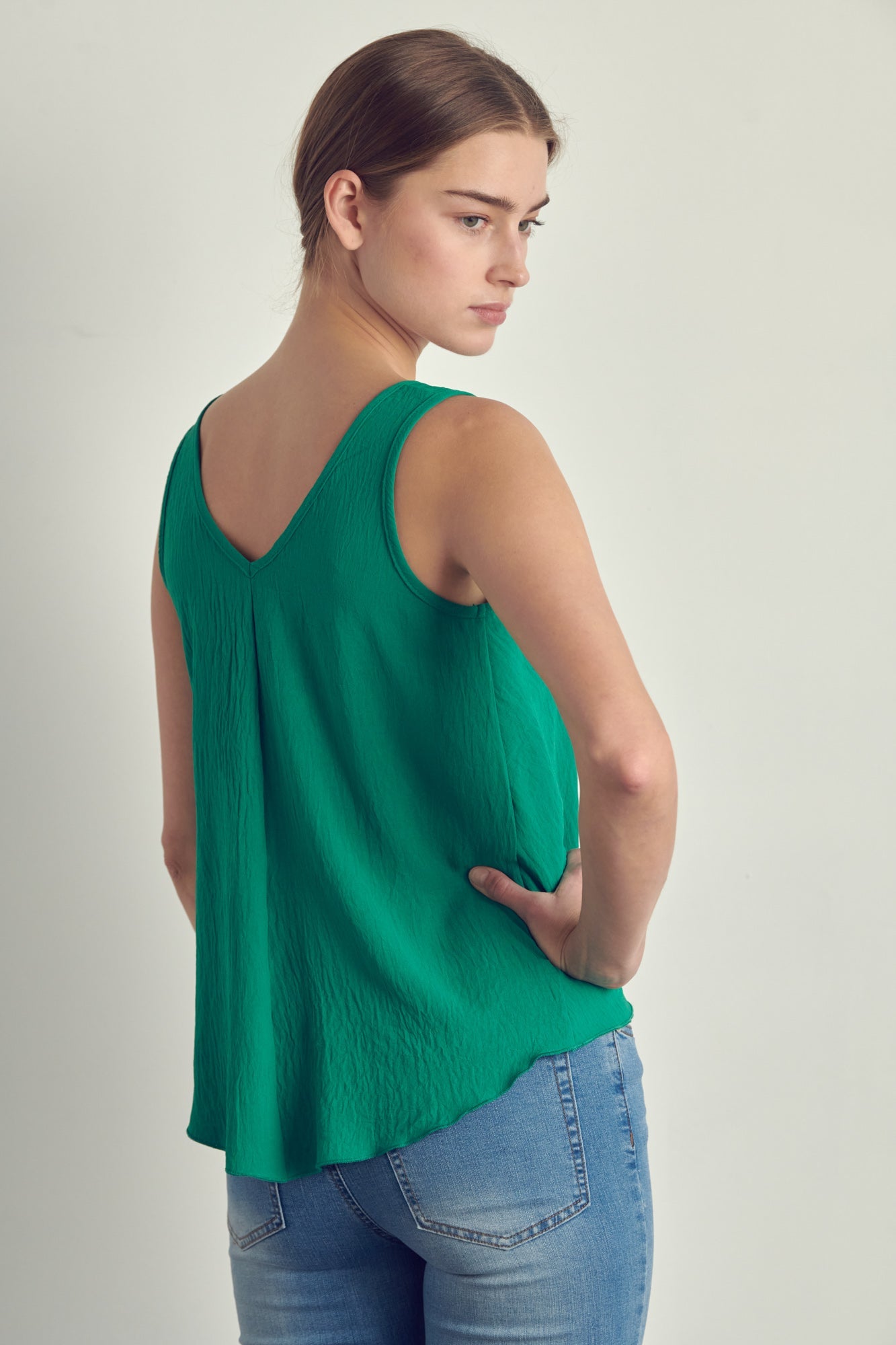 V-neck sleeveless knotted top by MILEY + MOLLY The hi-lo top helps cover the backside from unwanted exposure.  Made in... Read more Read more